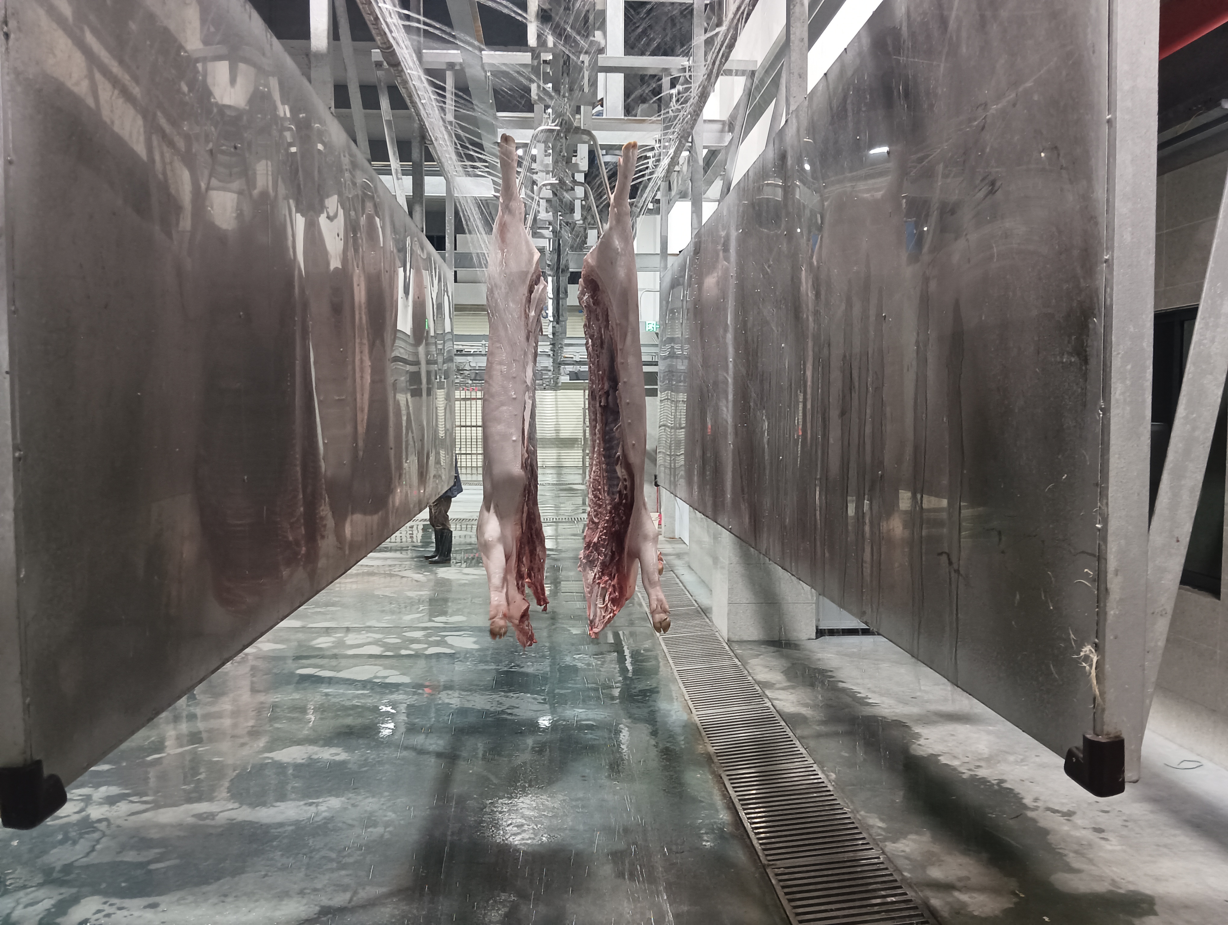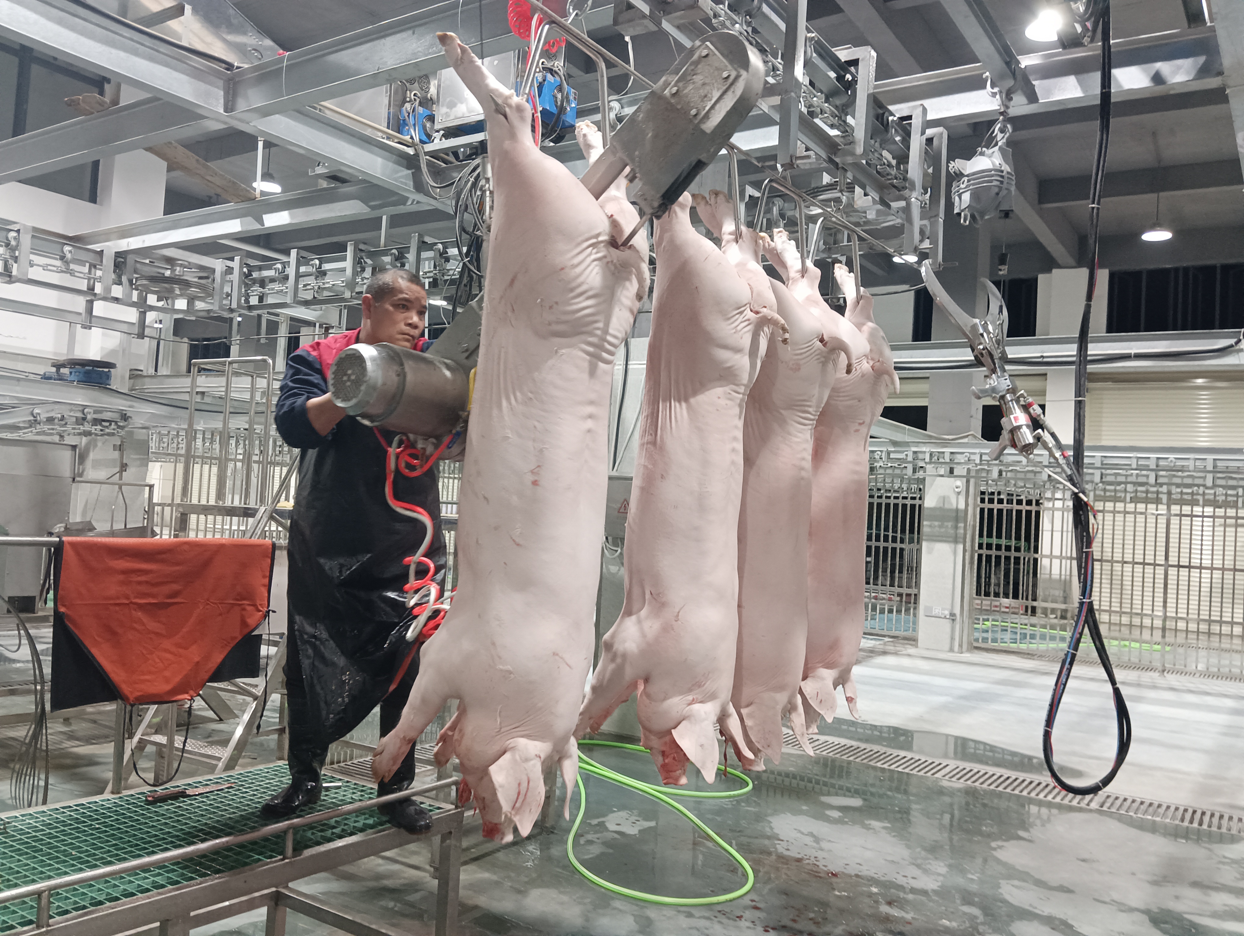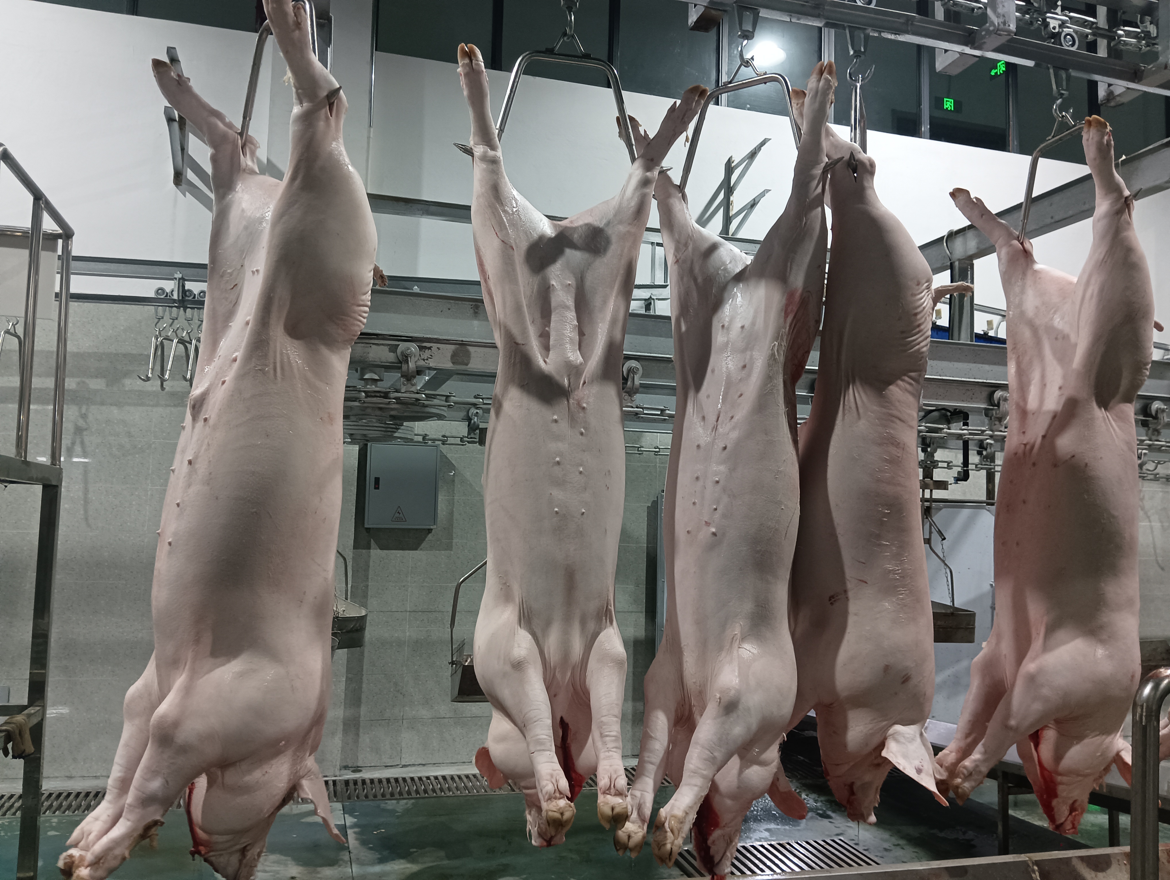 该屠宰场规模宏大、设施先进,按照高标准规划建设,屠宰场总投资8000万元,规划用地51亩,严格遵循省级屠宰企业建设标准及《生猪屠宰质量管理规范》实施建设。场区集生猪屠宰、肉品分割、冷冻肉品生产销售、冷链物流、检验检测等多功能于一体,配备自动化生产线、标准化检验室、无害化处理及污水处理系统,实现了生产流程全程智能化、标准化、规模化管控。据悉,屠宰场设计日屠宰产能1650头,年屠宰量可达60万头,能够100%满足云安区全区生猪屠宰及肉品供应需求,从源头破解了以往区域生猪屠宰产能不足、标准不高的难题。